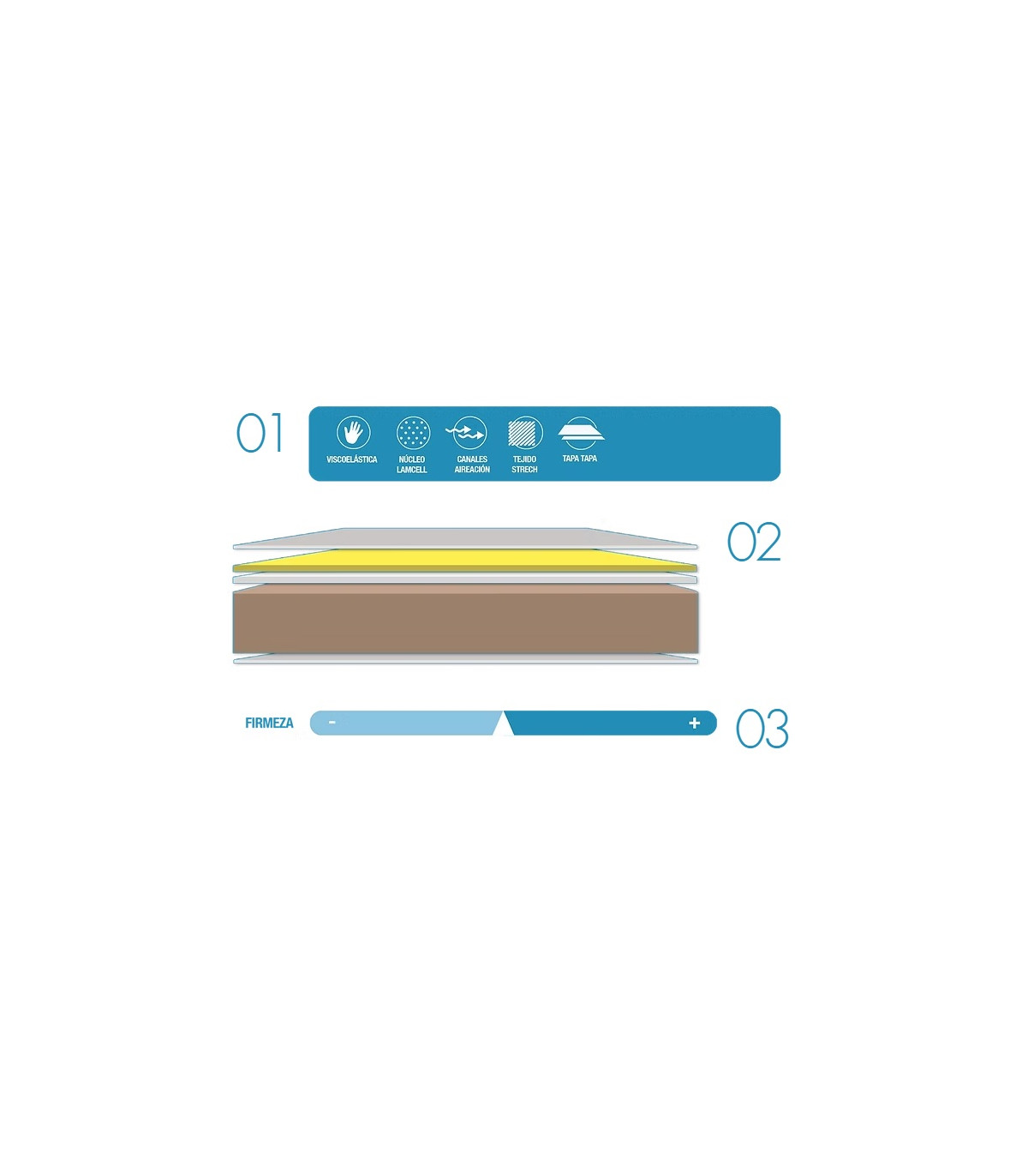 Fabricado en diferentes grosores, colchón viscoelástico de 4 cm de de 55 K poro abierto. Núcleo Lamcell de alta resistencia.